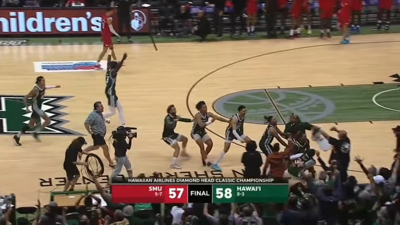 During the college basketball game between Hawaii and SMU, Hawaii’s JoVon McClanahan hit the game winning three pointer with just 0.9 seconds left. The shot gave Hawaii a 58-57 lead and they stopped SMU to hold on for the victory.