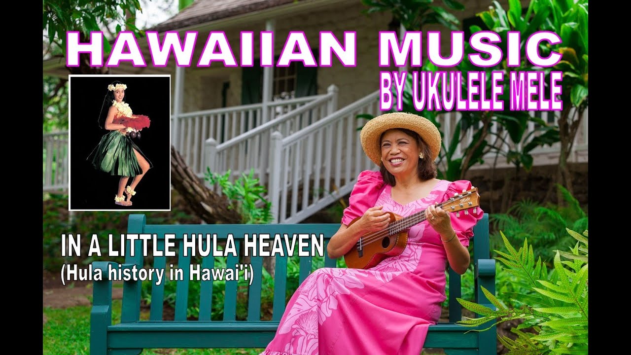 Mele Fong and her husband Richard Tom – The Hawaiian Serenaders – sing and play In a Little Hula Heaven on ukulele and u-bass over photos about the history of hula in the Hawaiian Islands and more (words below) #playuke #ukulelemusic #hawaiiansongs #hula